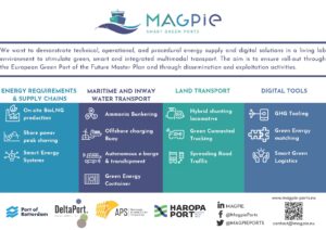 The main objective of MAGPIE is to demonstrate technical, operational, and procedural energy supply and digital solutions in a living lab environment to stimulate green, smart and integrated multimodal transport and ensure roll out through the European Green Port of the Future Master Plan and dissemination and exploitation activities.